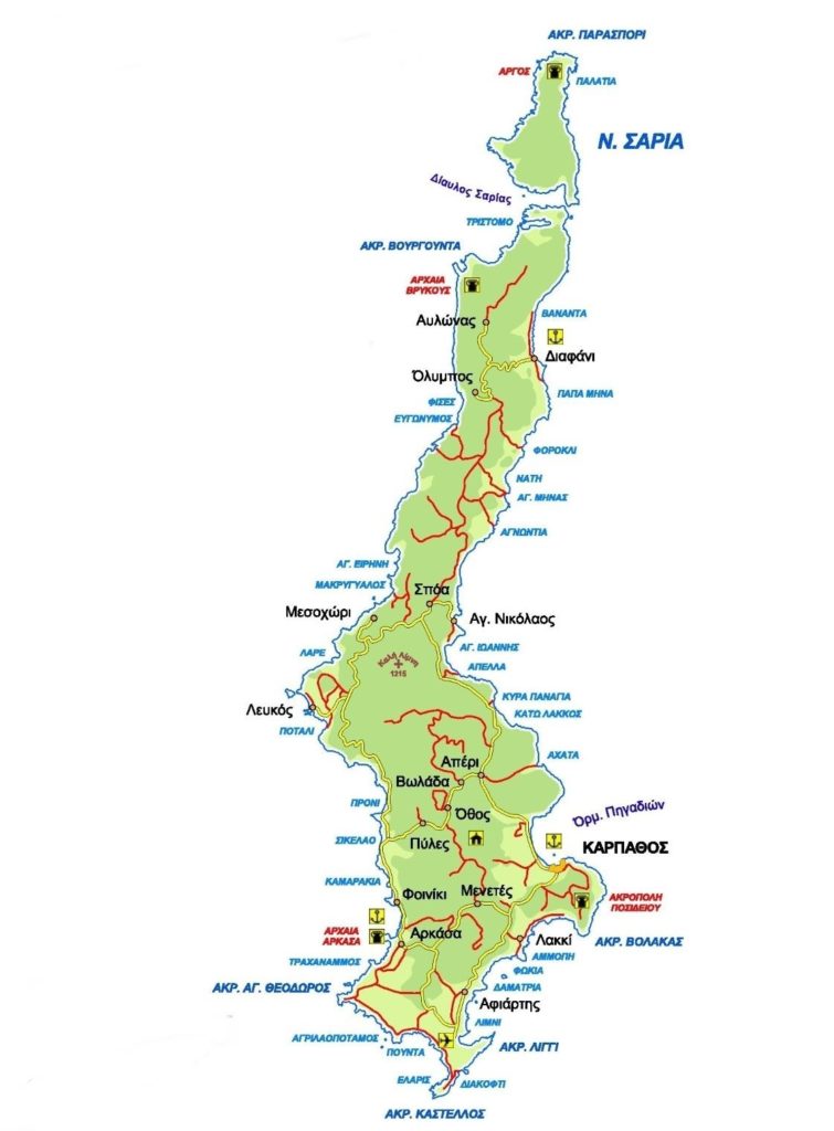 Ακόμα, πευκόφυτες πλαγιές που κατεβαίνουν ως τη θάλασσα, εκεί που τ’ ασπρογάλαζο κύμα φυλάει νωχελικά τις χρυσές αμμουδιές του νησιού. Οι τελευταίες είναι ότι καλύτερο έχει να προσφέρει η Κάρπαθος: Υπήνεμες, καθαρές, παρθένες οι πιο πολλές, γεμάτες υποσχέσεις: