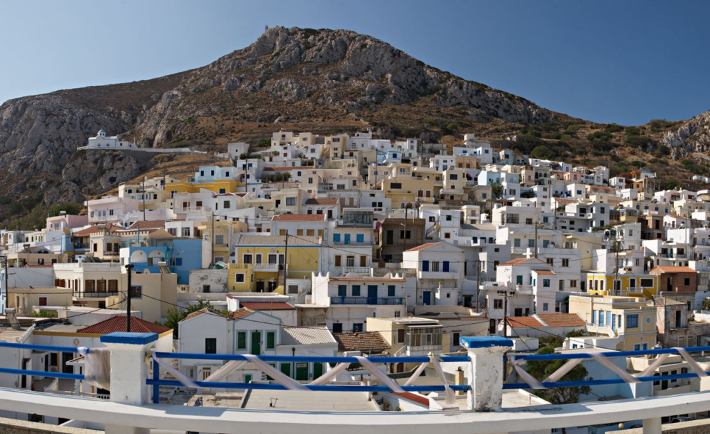The village is built in the south of the island at an altitude of 315 m above sea level on the northern slope of Mount Profitis Elias. It consists of 450 houses built close to each other, most of them in neoclassical style and has 662 permanent residents (according to the 2011 census).